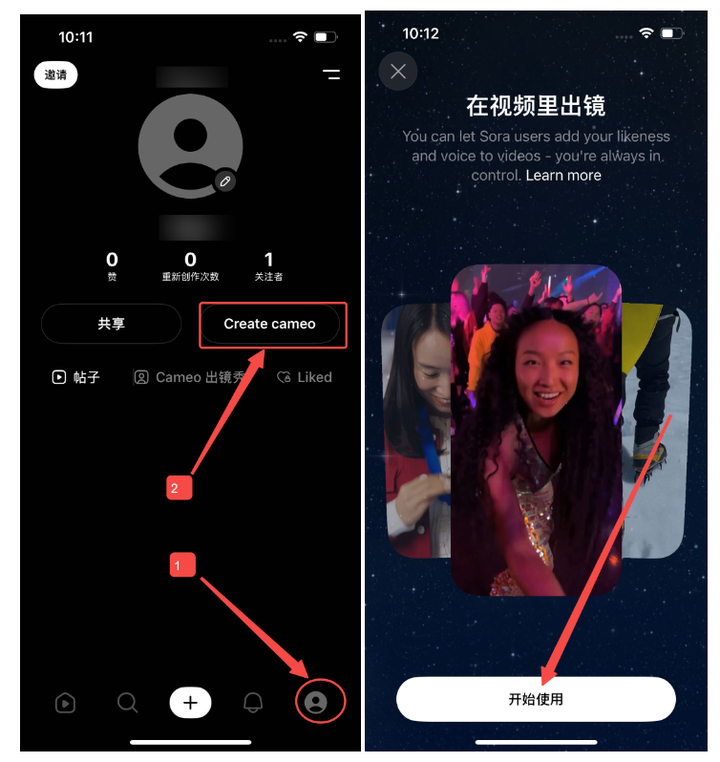 点击右下角的头像,再点创建cameo,根据提示念出数字,按照提示转动面部即可。
