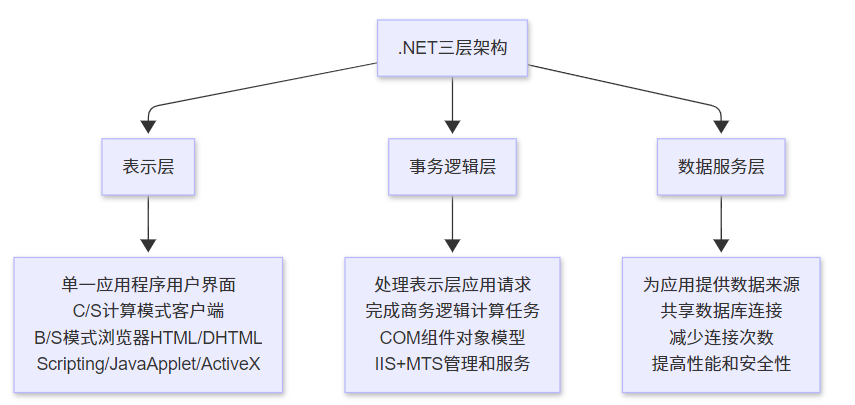 事务逻辑层 | 商务逻辑处理 | COM组件、IIS、MTS | 应用核心,COM是心脏 |