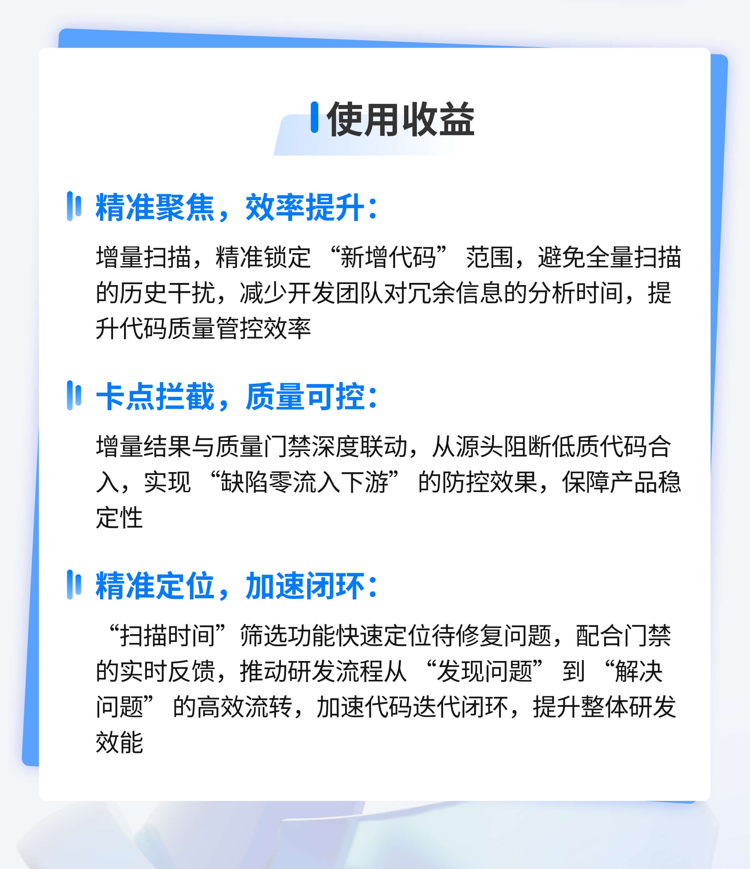 嘉为蓝鲸CCI持续集成平台新增代码检查功能,从增量扫描到精细化查询,从灵活扫描方式到严格质量红线,实现对新增代码质量的全链路管控,精准聚焦、效率提升,在保障产品稳定性的同时提升研发效能。