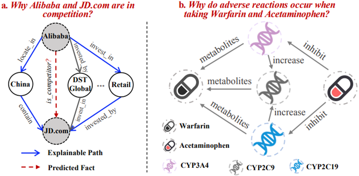 图1:(a) 多条可解释路径(蓝色)揭示了 Alibaba 与 JD.com 之间的竞争关系;(b) 在 华法林与对乙酰氨基酚共同使用时,多个代谢途径的协同作用导致不良反应的发生,从而解释了药物相互作用的机制。