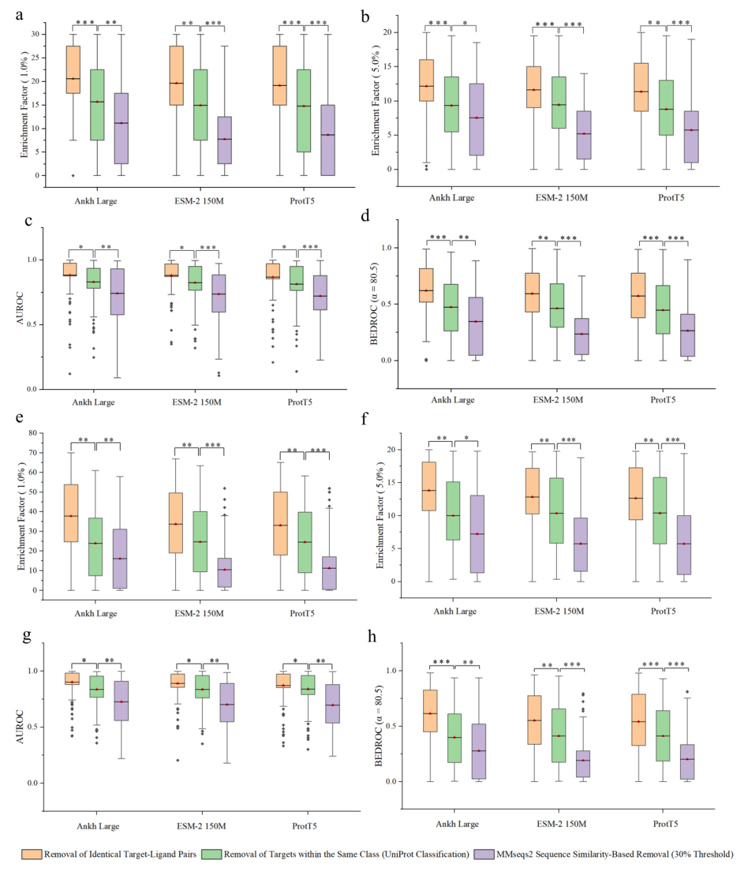 图3. 对三种蛋白质语言模型在不同去重标准下的泛化性能评估。(a-d)DEKOIS2.0 数据集。(e-h)DUD-E数据集。