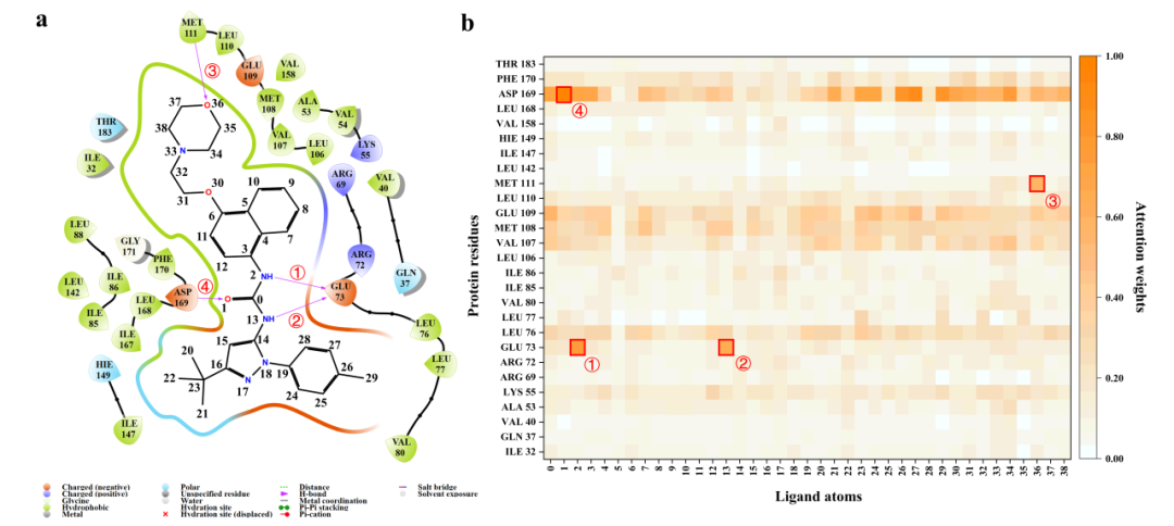 在可解释性方面,作者以 JNK2 蛋白复合物(PDB: 3NPC)为案例,结果如图6所示,展示了模型注意力热图与已知氢键互作之间的对齐关系。这表明即使没有显式输入三维结构或结合口袋位置,模型在数据驱动的学习过程中也能识别关键的原子-残基层面相互作用,这为理性药物设计提供了可信的线索。