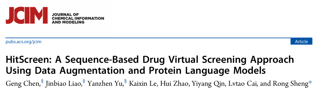 (1) Chen, G.; Liao, J.; Yu, Y.; Le, K.; Zhao, H.; Qin, Y.; Cai, L.; Sheng, R. HitScreen: A Sequence-Based Drug Virtual Screening Approach Using Data Augmentation and Protein Language Models. J. Chem. Inf. Model. 2025.