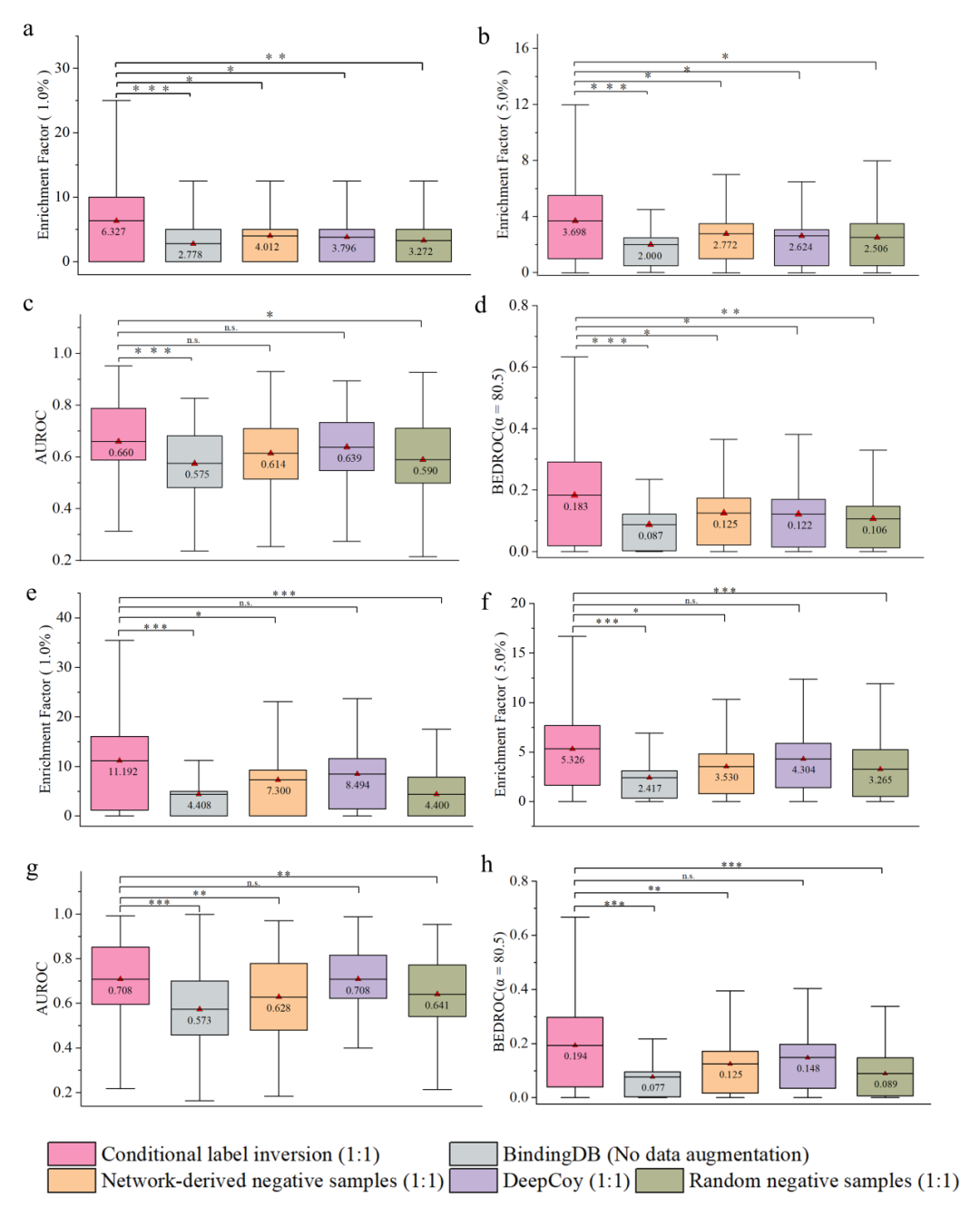 图 2. DrugBAN 模型在 BindingDB 数据集上对不同数据增强方法进行比较。(a-d)不同数据增强方法在 DEKOIS2.0 数据集上的表现。(e-h)不同数据增强方法在 DUD-E 数据集上的表现。
