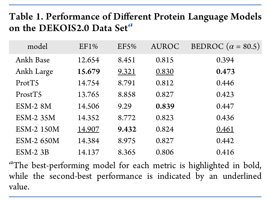 在蛋白语言模型的选择上,作者在 HitScreen 框架中评估了 9 种不同的模型,均在 ChEMBL33 数据集上训练,并在 DEKOIS2.0上测试。结果如表1所示,不同的蛋白语言表征确实会存在性能差异,但整体差距不大。
