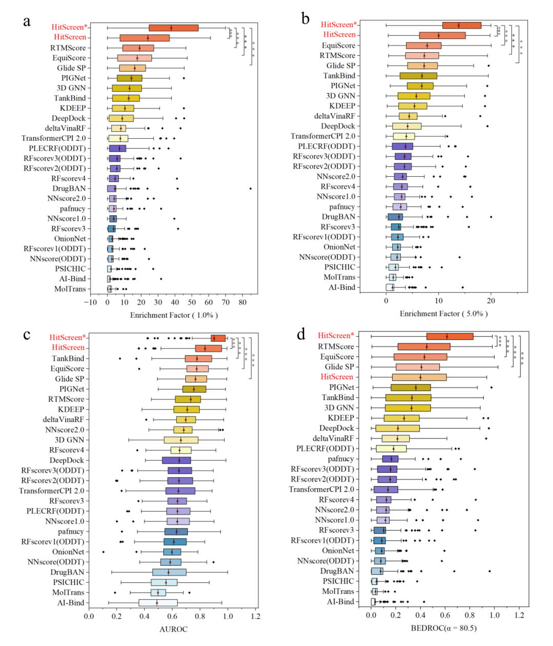 图4. 27 种打分函数在 DUD-E 数据集上的评估(HitScreen*为靶标-配体对去重,HitScreen为UniProt靶标去重)。