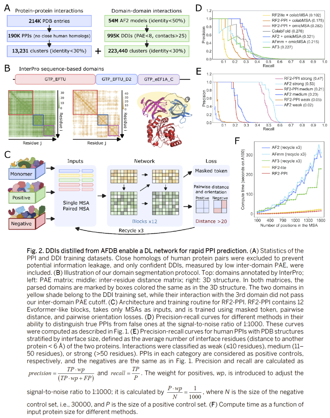 研究人员基于RoseTTAFold2架构,结合PDB的实验性PPI与从AlphaFold数据库提取的高置信度DDI,训练了一个大规模网络(RF2-PPI)。这一策略极大增加了训练数据规模,使其性能超越以往轻量化方法。与AlphaFold3或AF-multimer相比,RF2-PPI在区分真实互作和非互作方面更为准确,尤其在弱互作预测中具优势,同时计算效率显著提升。