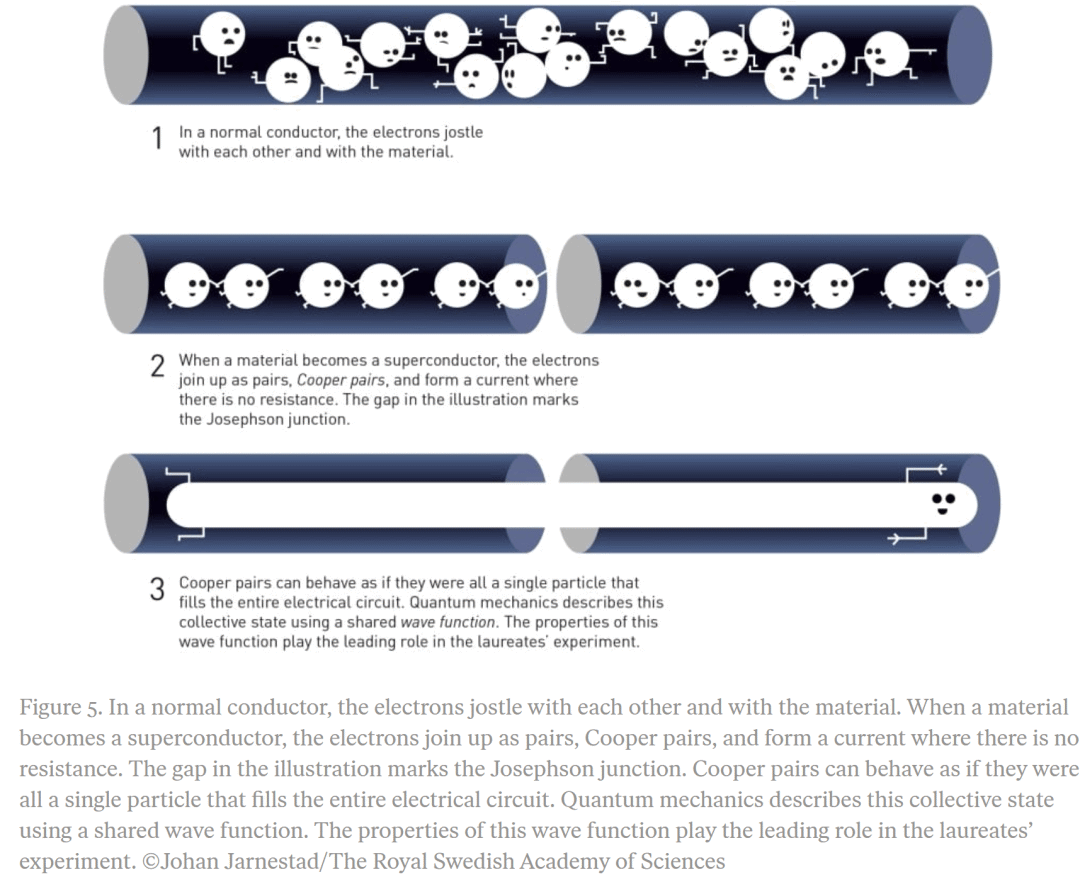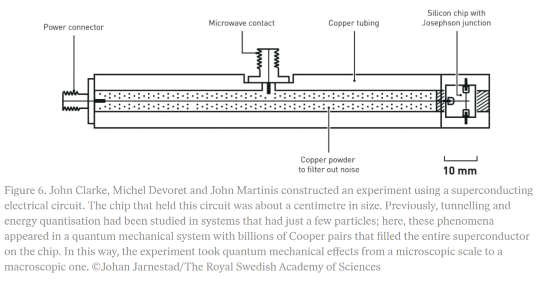 电路中的两个超导部分被一层极薄的绝缘层分隔,这种结构被称为约瑟夫森结(Josephson junction)。通过对电流、电压与能量态的精密测量与控制,他们揭示出系统内部奇异的量子现象:“无数电子在超导体中协同运动,表现得就像一个巨大的单一粒子——一个充满整个电路的宏观量子态。”