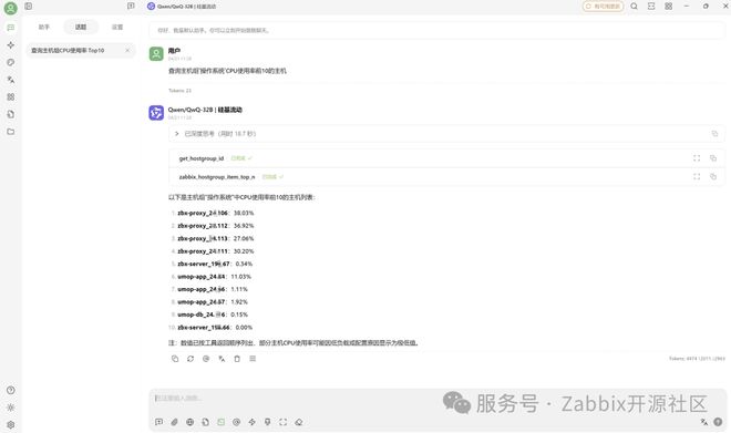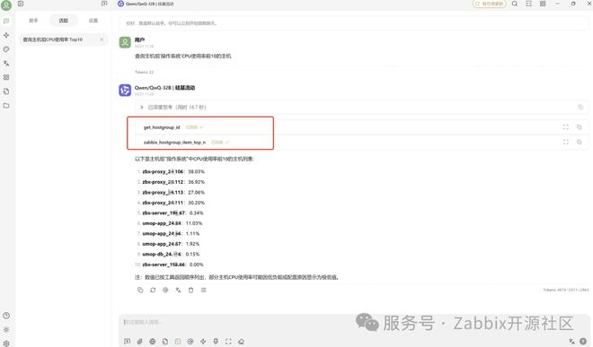 当我们通过Cherry Studio向大模型提问“查询主机组'操作系统'CPU使用率前10的主机”时,可以看到大模型调用的工具里包含了我们自定义的以下两个工具,并且根据调用步骤返回了从zabbix查询的实时数据: