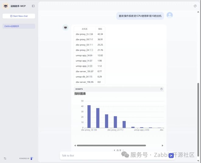 我们使用Dify构建一个可以通过表格和图表方式显示TOP N报表的Agent。当我们提问“查询'操作系统'的'CPU使用率'前10的主机“时,大模型帮我们到zabbix获取实时数据并且以表格和图表的方式进行展示。
