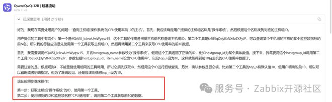 向大模型提问“查询主机组'操作系统'CPU使用率前10的主机”,大模型会根据语义提取参数调用MCP Server的tools,如下图所示,可以看到大模型深度思考的过程: