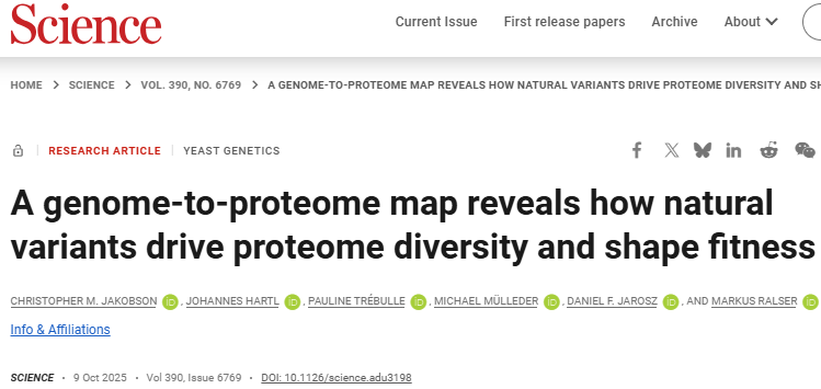 Christopher M. Jakobson et al. ,A genome-to-proteome map reveals how natural variants drive proteome diversity and shape fitness.Science390,eadu3198(2025).