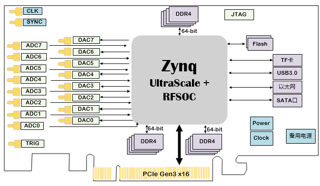 板卡使用Xilinx的第三代RFSOC系列,单颗芯片包含8路ADC和DAC,64-bit Cortex A53系列4核CPU,Cortex-R5F实时处理核,以及大容量FPGA。