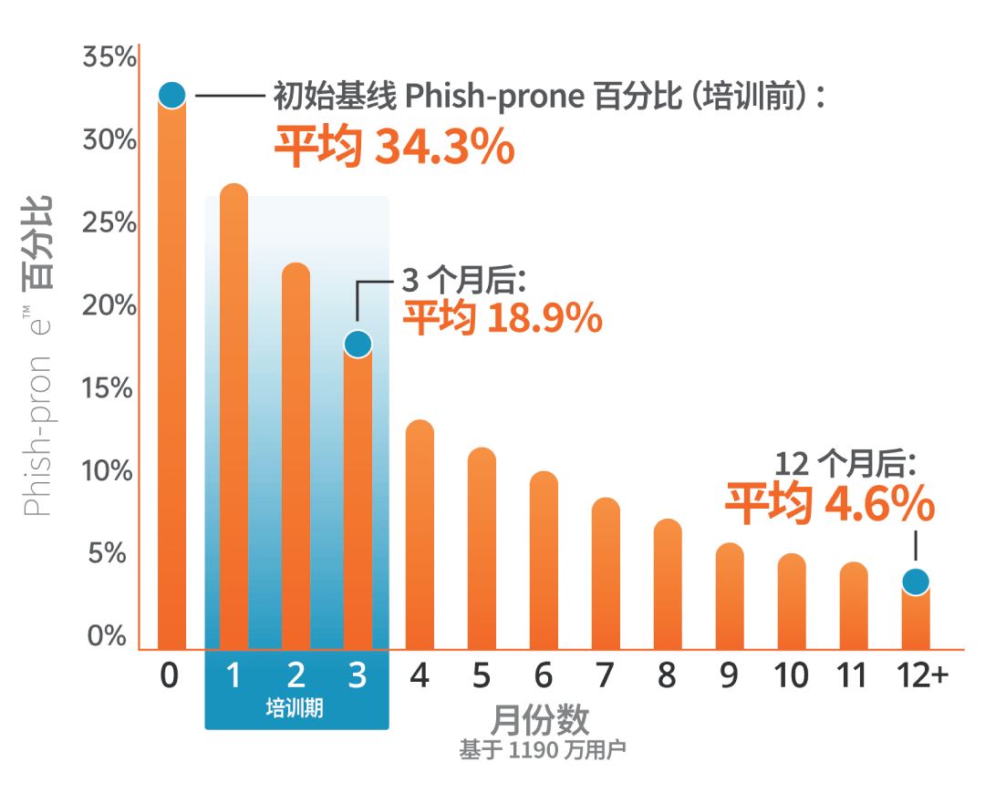 培训效果在全球范围内也得到了证实:12个月的安全意识培训后,各行业的平均PPP下降86%至4.1%。可喜的是,这种下降趋势还将长期持续——持续培训2年后,平均PPP下降至3.7%,三年后下降至3.6%。各行各业都出现了这种下降趋势(联系我们获取完整报告)。
