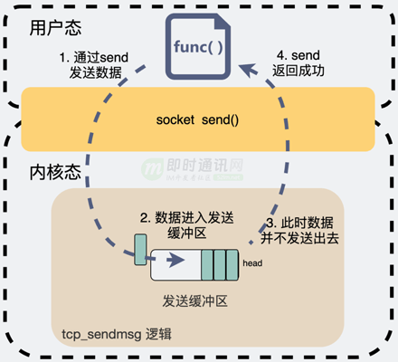 上面是一段伪代码,仅用于展示大概逻辑,我们在建立好连接后,一般会在代码中执行 send 方法。那么此时,消息就会被立刻发到对端机器吗?