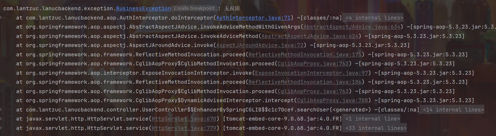 2025-10-15 17:13:48.649 INFO 23396 --- [nio-8080-exec-5] c.l.lanucbackend.aop.LogInterceptor : request start,id: ad4061ee-d5ed-47f3-bf2e-e0567867fabc, path: /api/user/login, ip: 0:0:0:0:0:0:0:1, params: [UseLoginRequest(userAccount=Lantz, userPassword=12345678), org.apache.catalina.connector.RequestFacade@6ce7aed7]