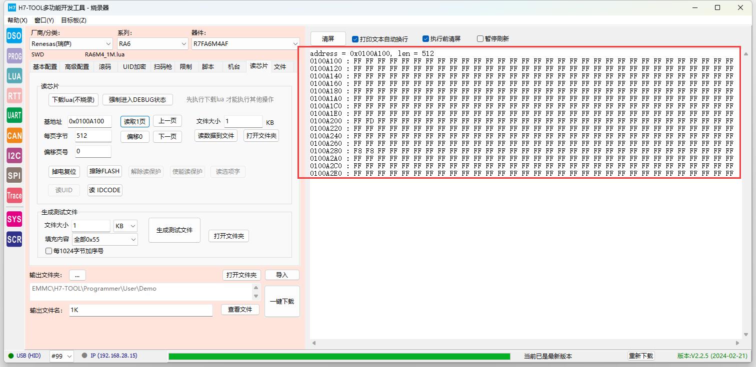 【测试】 从地址0x0100A100读取出来0x200字节,出厂默认全部是0xFF