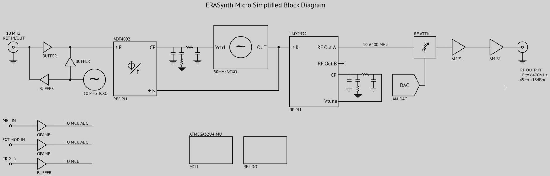 ERASynth Micro 是一个开源信号发生器,可通过 USB 端口供电,并具有 LCD 接口,无需PC即可独立使用。它采用双 PLL 架构,可生成 12.5 MHz 至 6.4 GHz 的低相位噪声 RF 信号。