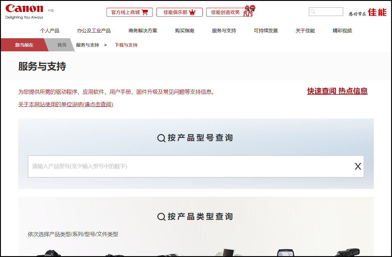 ② 在官网的“支持”、“服务”或“驱动下载”页面,找到搜索框或产品分类,搜索打印机型号。