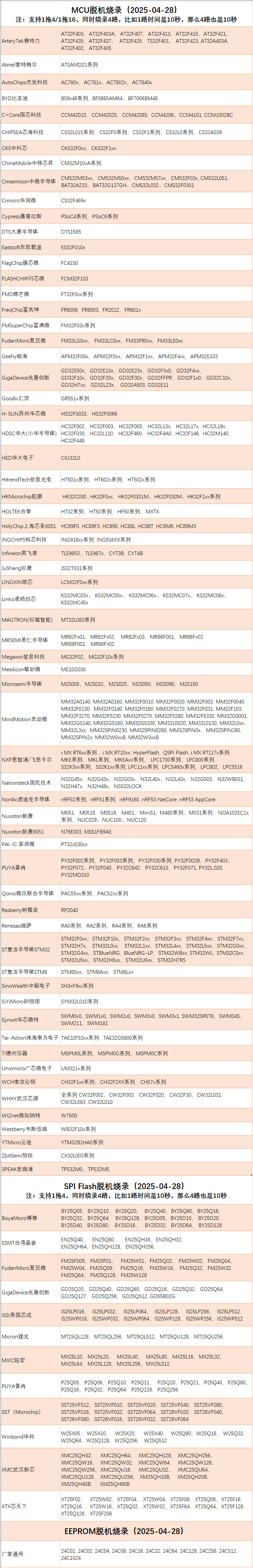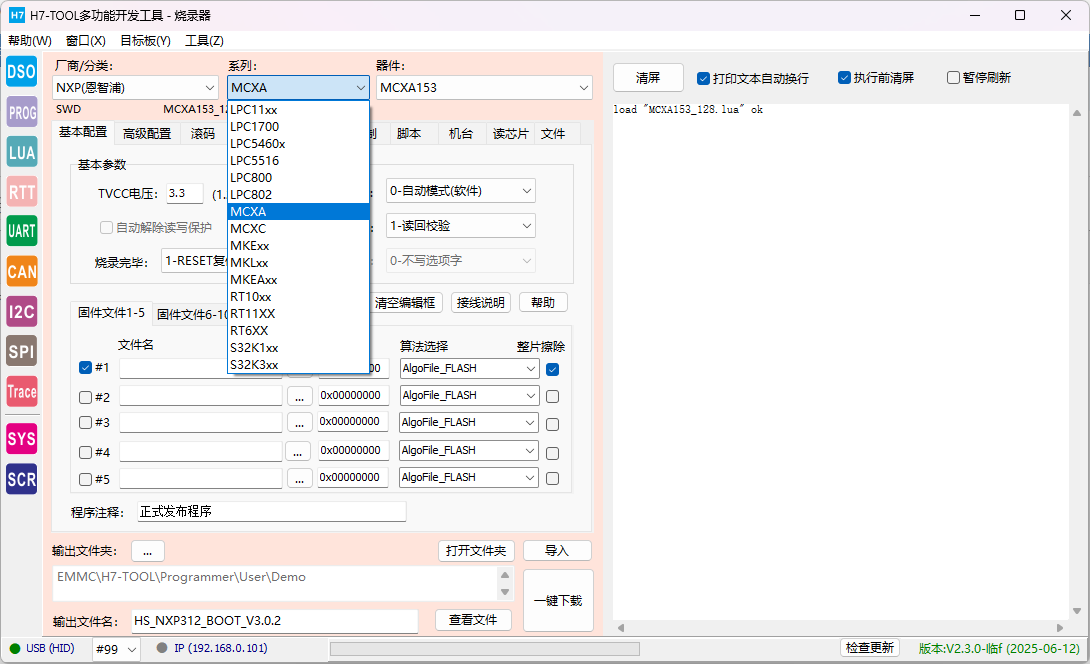当前这些支持已经全部集成到下次发布得V2.30版固件中,如果有用到这些器件的,可以联系我们先获取临时版使用。 1、全部在实际硬件上测试通过,支持单路,1拖4和1拖16 2、本次新增 (1) NXP MCXA153 MCXA156 (2) 航天民芯MT006 (3) 小华半导体HC32L02x, HC32L07x, HC32F420 (4) 普然PY32T020 (5) 国民技术N32G4FR (6) 兆易创新GD32L235 (7) 华大电子CIU32F003 部分截图: