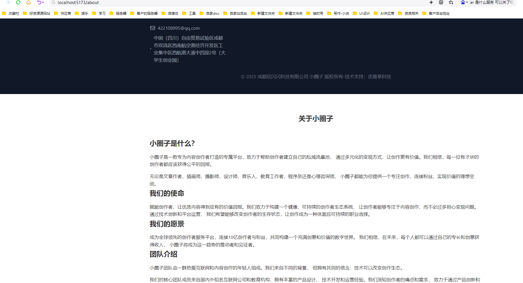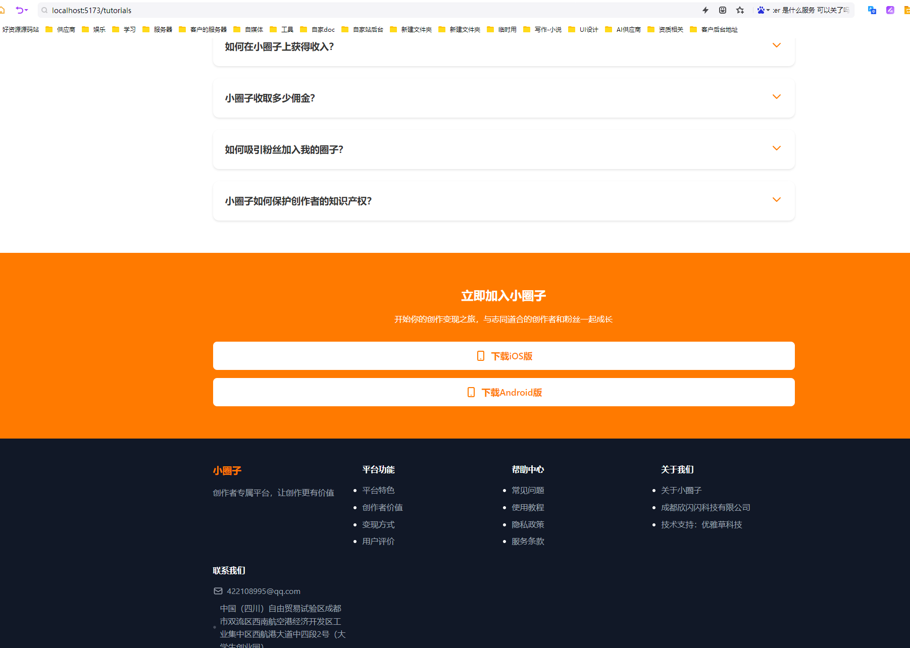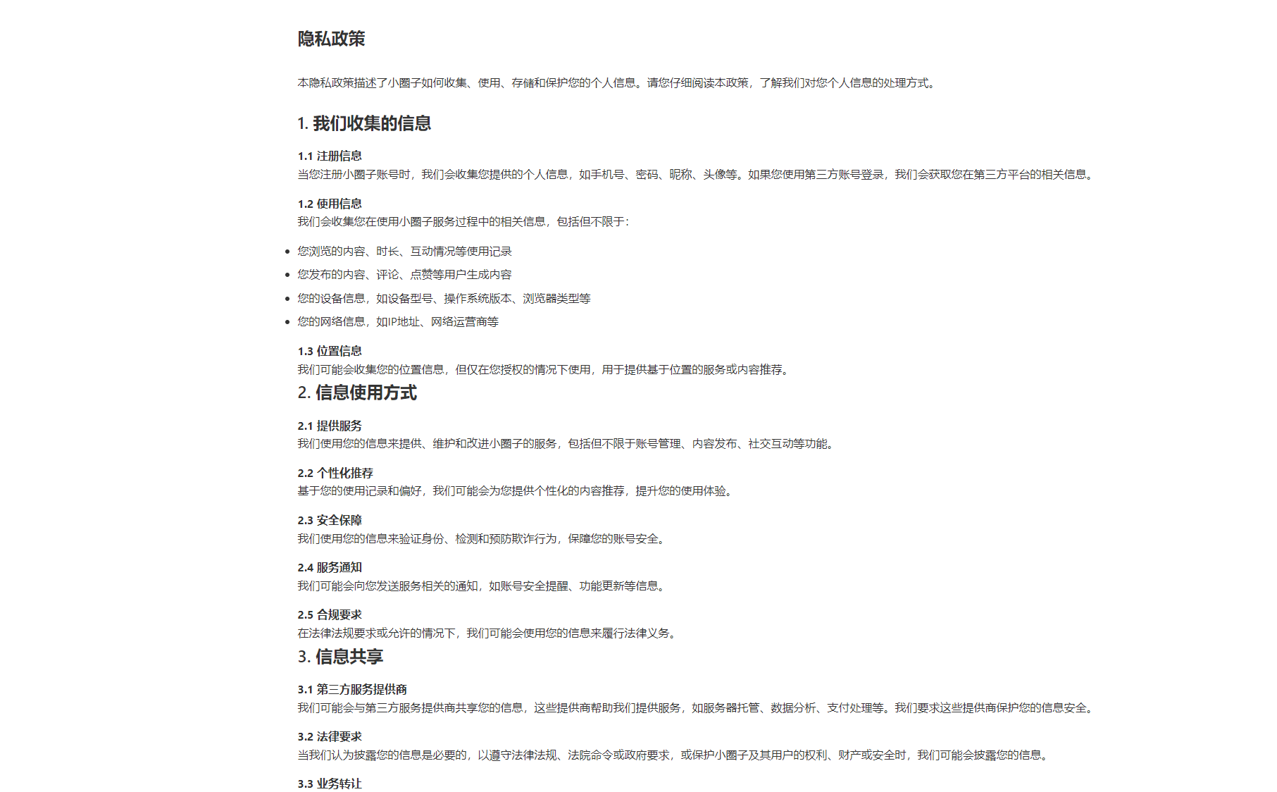 小圈子增加一个关于我们,平台特色,创作者价值,变现方式,用户评价,常见问题,使用教程,隐私政策,服务条款请都分别建立页面,关于我们请完整的写一个关于小圈子APP的介绍, 另外底部联系方式