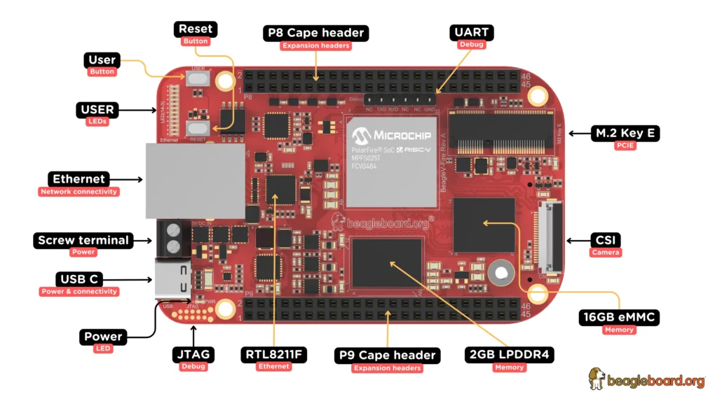 芯片采用Microchip 的 PolarFire MPFS025T ,带5核RISC-V和FPGA架构提供支持