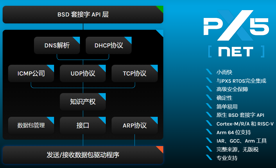 PX5 Net特色: (1)PX5 NET的最小需求<6KB FLASH和<2KB RAM),可在一些内存最受限的设备中实现网络连接。 (2)同样支持PX5 RTOS的供内存保障技术PDV。 (3)原生支持BSD Socket,嵌入式 Linux 上运行的网络应用程序可以很容易地在 PX5 NET 下运行,反之亦然。