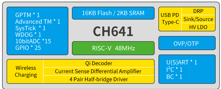 CH641系列是基于青稞RISC-V2A内核设计的PD无线充电专用微控制器。该系列具有宽压、单线调试、低功耗、外围精简等特点。CH641内置PD PHY、BC接口、差分输入电流采样和交流小信号放大解码器,支持USB PD及Type-C快充功能、BC1.2及DCP等多种HV充电协议,提供了DMA控制器、10位模数转换ADC、多组定时器、USART串口、I2C等丰富的外设资源,提供过压保护和过温保护。