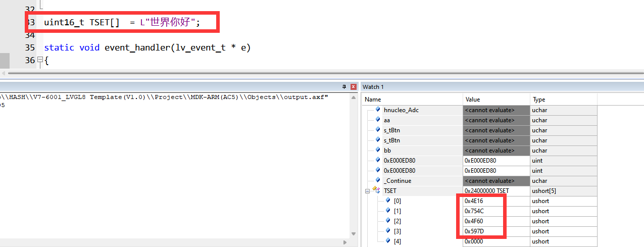 (2)MDK字符串前面加L将字符转Uincode编码注意事项