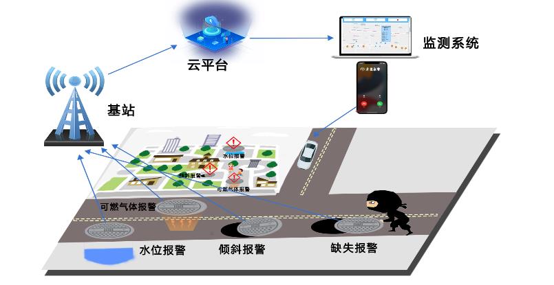 智能井盖传感器是一种基于物联网技术的新型智能传感器,该产品利用无线通信模块及高精度压力传感器实现与监控中心的远程通信,以解决城市中井盖管理的难题。该产品将传感器和无线传输模块进行结合,在智能井盖上安装专用的无线通信模块,利用专用通信模块采集井盖状态信息,并通过无线传输模块将数据上传至监控中心。当井盖出现异常时,监控中心可通过短信、电话等多种方式通知相关人员,防止人员、车辆误入窨井造成安全事故。
