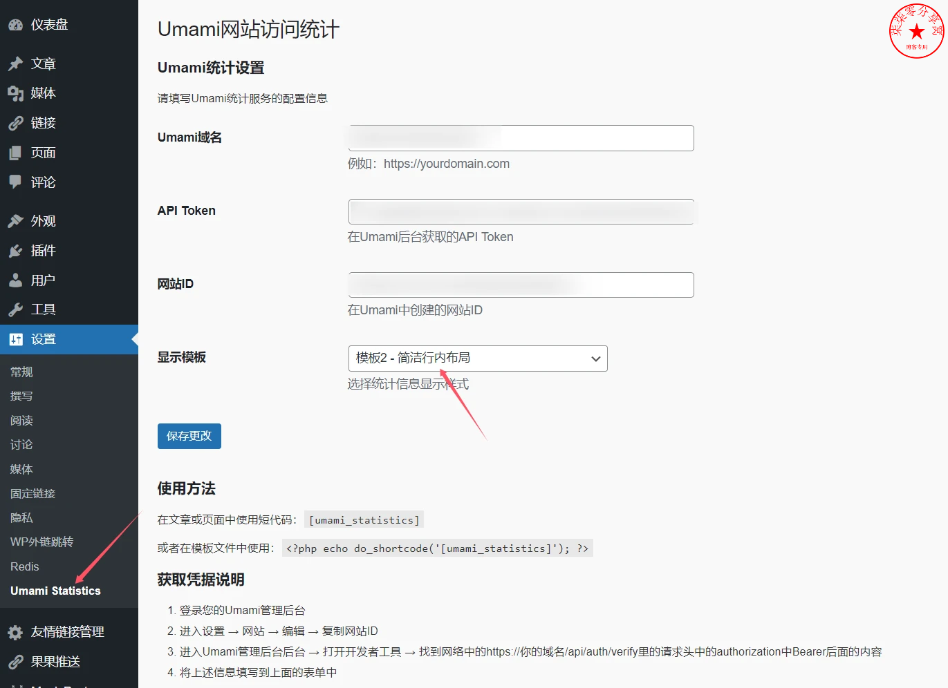 1.后台自定义填写Umami域名、API Token、网站ID信息;