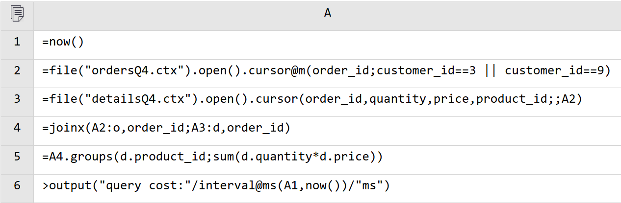 例 4.2 客户号是 3 或 9 的订单,按照产品号分组统计订单金额。