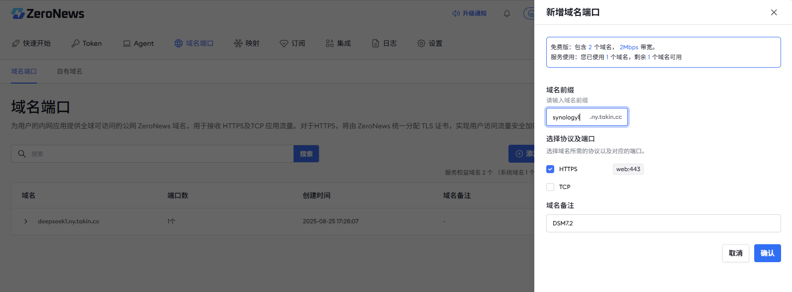 2. 在 "域名端口" 页面中, 点击 "添加域名" ,为您的群晖NAS分配域名。