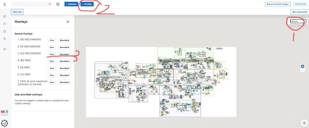 2.将背景调整Network,然后点击2所在的Overlays,出现3所在界面,选择SLE MECHANISMS View。3所在Downlad只是文献PubMed ID号。不是下载图片。