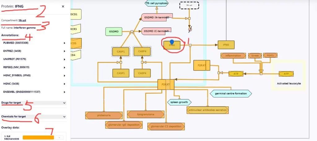 5.点击分子,可以查看分子名称注释ID以及靶向药物与化合物信息。1选择所在位置的分子。2. 分子名称。3 分子所在的细胞区域。 4.分子名称各种类型ID。5-6靶向的药物与化合物。7 是橙色是SLE分子机制相关的通路。