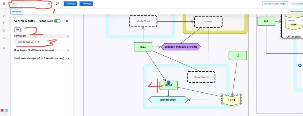 6.搜索基因:可以在1所在搜索框进行这个分子机制图中搜索感兴趣的基因所在位置。如输入Bcl6,点击Q。然后2所在位置出现搜索结果,点击3所在位置。即可见分子机制图中BCL6所在位置。