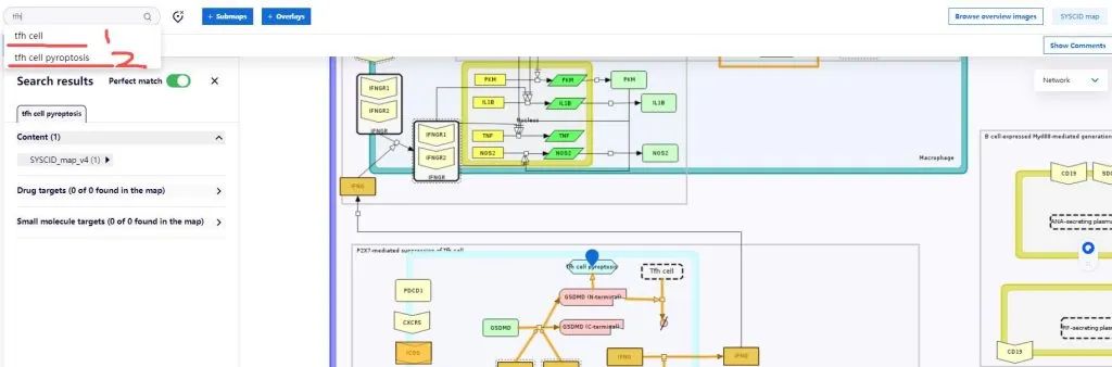 7.搜索细胞或者通路:实际上在这个分子机制图上,凡是出现的文字都可以被搜索到。只要在输入框输入关键字,其自动匹配相关内容。如输入Treg,就出现两个结果,一个细胞类型,一个相关生物学过程。