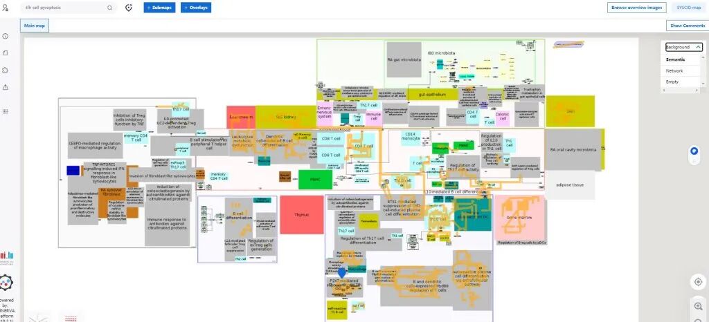 1.登录网站https://syscid.elixir-luxembourg.org/,网页界面如下。交互式图形界面,用鼠标滚轮可以放大缩小。不同色块代表着组织、细胞类型或者分子通路名称。如果要看更细致的分子机制,则需要通过Backgroud来调整图形显示。