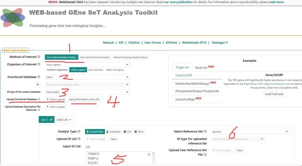 4.WebGestalt网站进行富集分析:上传GMT格式的数据集,输入待富集的基因集。1选择富集模式。2.在Functional Database选择Others. 3选择ID type 为Genesymbol. 4.在Upload Functional Database中点击 click to upload 进行数据集上传。5.在Input ID list中输入差异基因集。6.Select Refernce Set选择Genome.