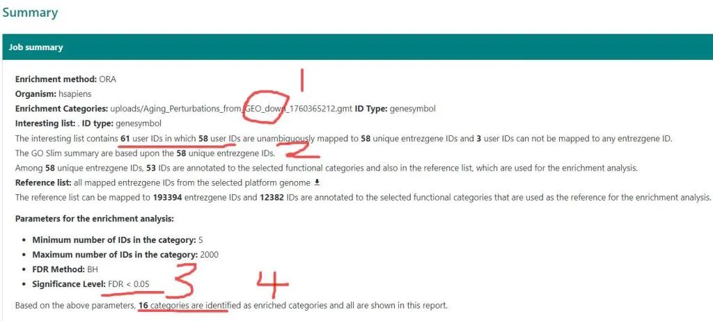 6. 富集结果展示。 1所示我们上传的数据集信息。2是我们提供的差异基因信息。3是筛选条件。4是富集到的Terms 数量。