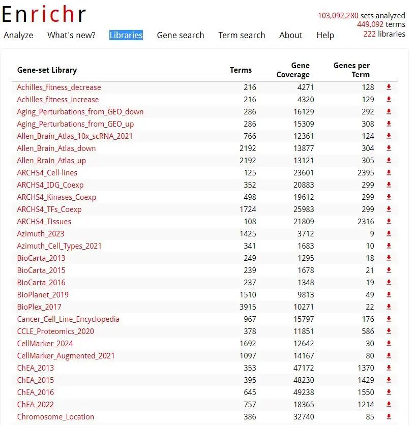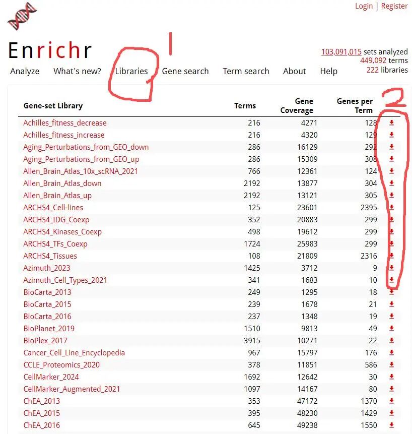 1.在Enrichr网站上,选择Libraries,选择目标富集数据集,点击2所在位置的下载按钮,进行数据集下载。