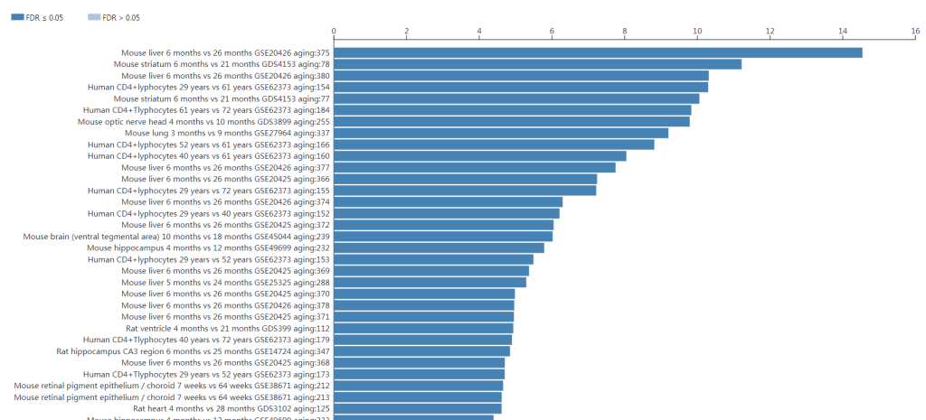 8. 展示衰老相关转录上调基因数据集:我们依然用干扰素相关基因集,选用衰老上调基因数据集进行富集分析,结果发现非常矛盾的一点是,干扰素基因反而富集在年龄小小鼠或者人的组织、细胞上。尤其是在月龄小的小鼠肝脏来源的转录组数据中。因此。数据集富集结果只是一个推测的分析方法。数据集是否具有较好的鲁棒性需要不同来源的数据集比较才能知晓。