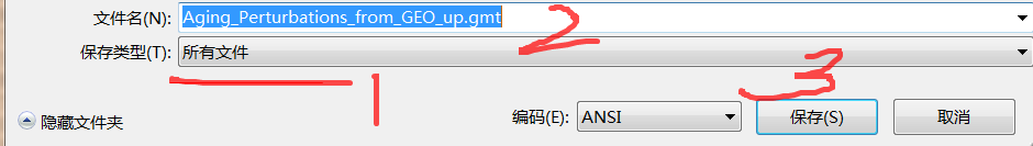 3.将数据集格式从txt转换为.gmt格式,用记事本打开数据集txt文件,点击另存为后,选择所有文件类型选项。文件后缀加入.gmt字样,再进行保存。