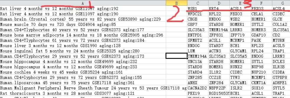 2.数据集格式:下载本地电脑后,数据集为txt格式,可以用excel方式打开。A列为每一个terms的描述性内容,B是空白或者数据集的链接。C列还是是基因名,一个单元格是一个基因信息。