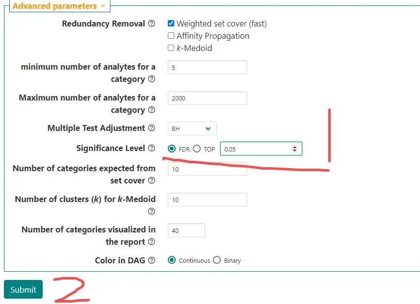 5. 富集条件筛选:选择FDR<0.05.如果后续富集结果数量过少,在选择Top 100 ,top20来进行富集结果扩充。