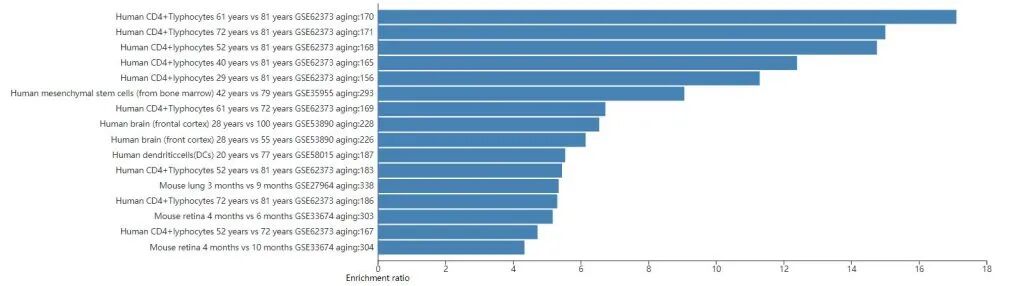 7. 展示目的基因在哪些数据集中进行了富集。如下图所示,我们提供了干扰素相关基因,选用衰老相关转录组下调基因数据集。富集结果主要在人CD4+T细胞年龄小vs 年龄大中下调(反过来理解就是在年龄大组CD4+T细胞中基因上调)