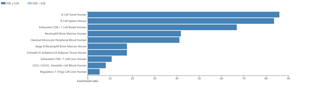 9.利用Cellmarker_2024 数据集进行了的干扰素基因集富集分析结果如下:干扰素基因通常富集在免疫细胞中如B、T、中性粒细胞、DC细胞中。当然,首先要理解为什么要做差异基因与Cellmarker之间的富集分析。目的是看我们筛选的目的基因在哪些细胞中富集表达,为后续研究特定细胞给出充分理由。