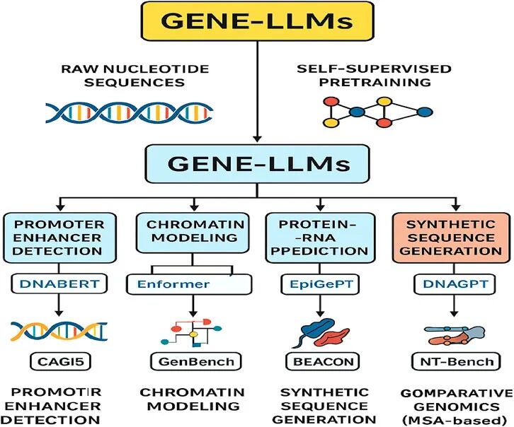 Vellore理工学院研究人员探索了人工智能和生物学之间令人兴奋的交集,其中语言模型最初是为文本开发的,如ChatGPT,现在正被用来解释DNA。这些新系统被称为基因组大语言模型(Gene-LLMs),它们被训练来阅读和理解遗传密码,就像自然语言模型学习阅读和理解人类语言一样。