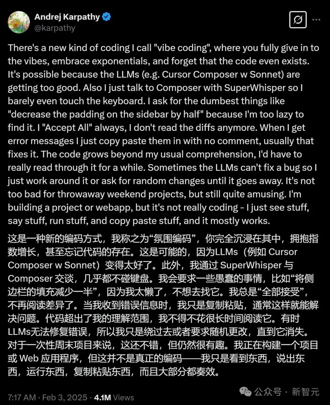「vibe coding」这个概念最早就是由Karpathy提出的。简单说就是通过对话让LLM编写代码,而你只需要沉浸在解决问题的「氛围」中,同时忽略生成的代码细节。用Karpathy大神的话说就是,「我只是看到东西,说出东西,运行东西,复制粘贴东西,而且大部分情况都奏效。」 新智元,公众号:新智元Karpathy带火「Vibe Coding」!YC证实:1/4新初创,95%代码全由AI生成