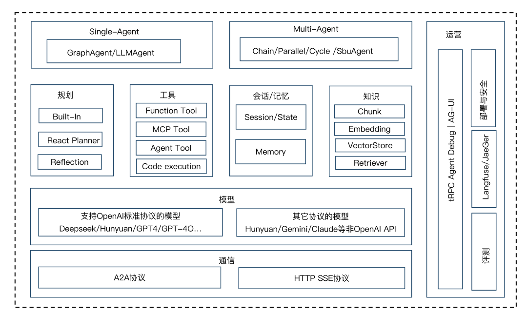 tRPC-Agent-Go(https://github.com/trpc-group/trpc-agent-go) 框架集成了LLM、智能规划器、会话管理、可观测性和丰富的工具生态系统。支持创建自主Agent和半自主Agent,具备推理能力、工具调用、子Agent协作和长期状态保持能力,为开发者提供构建智能应用的完整技术栈。